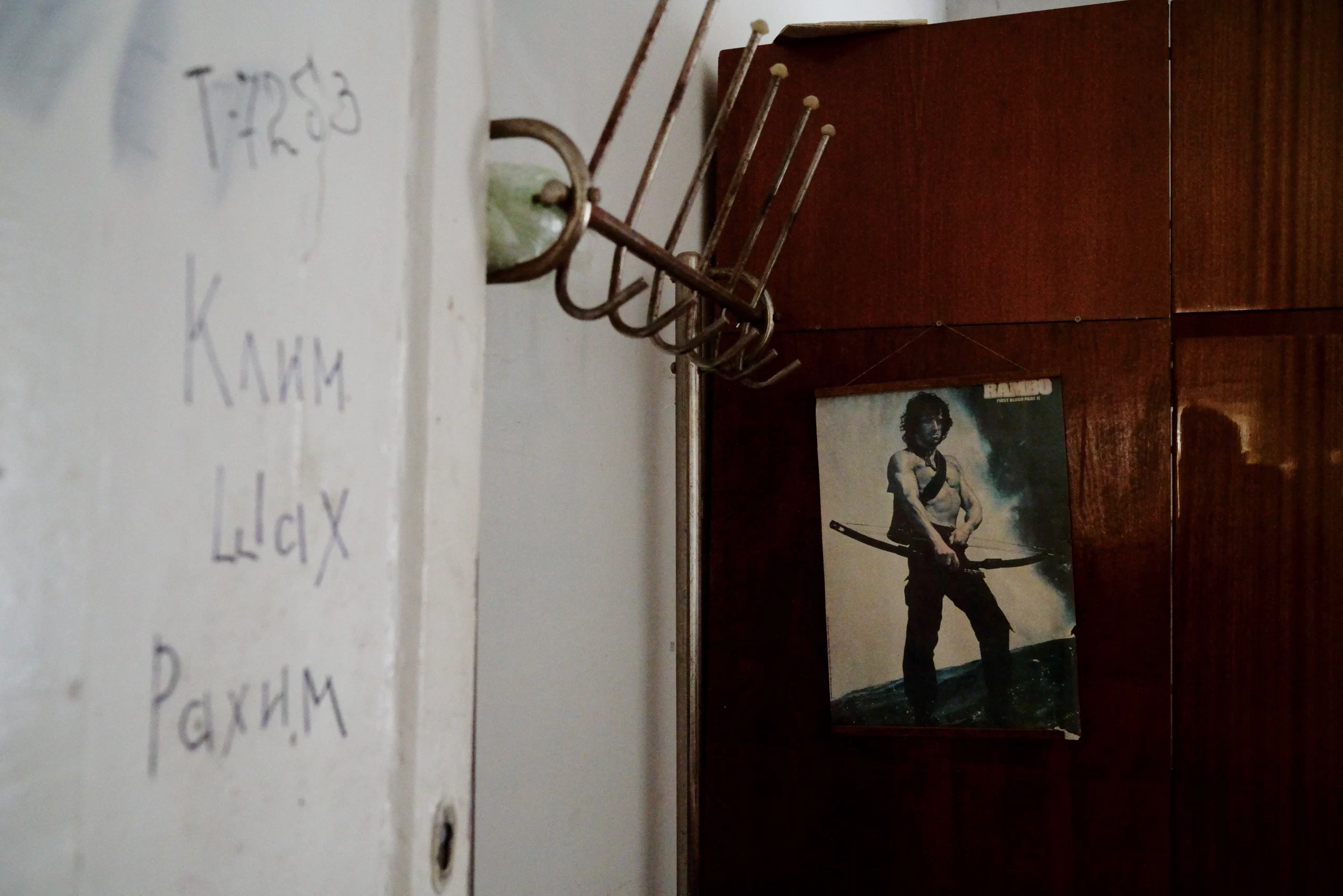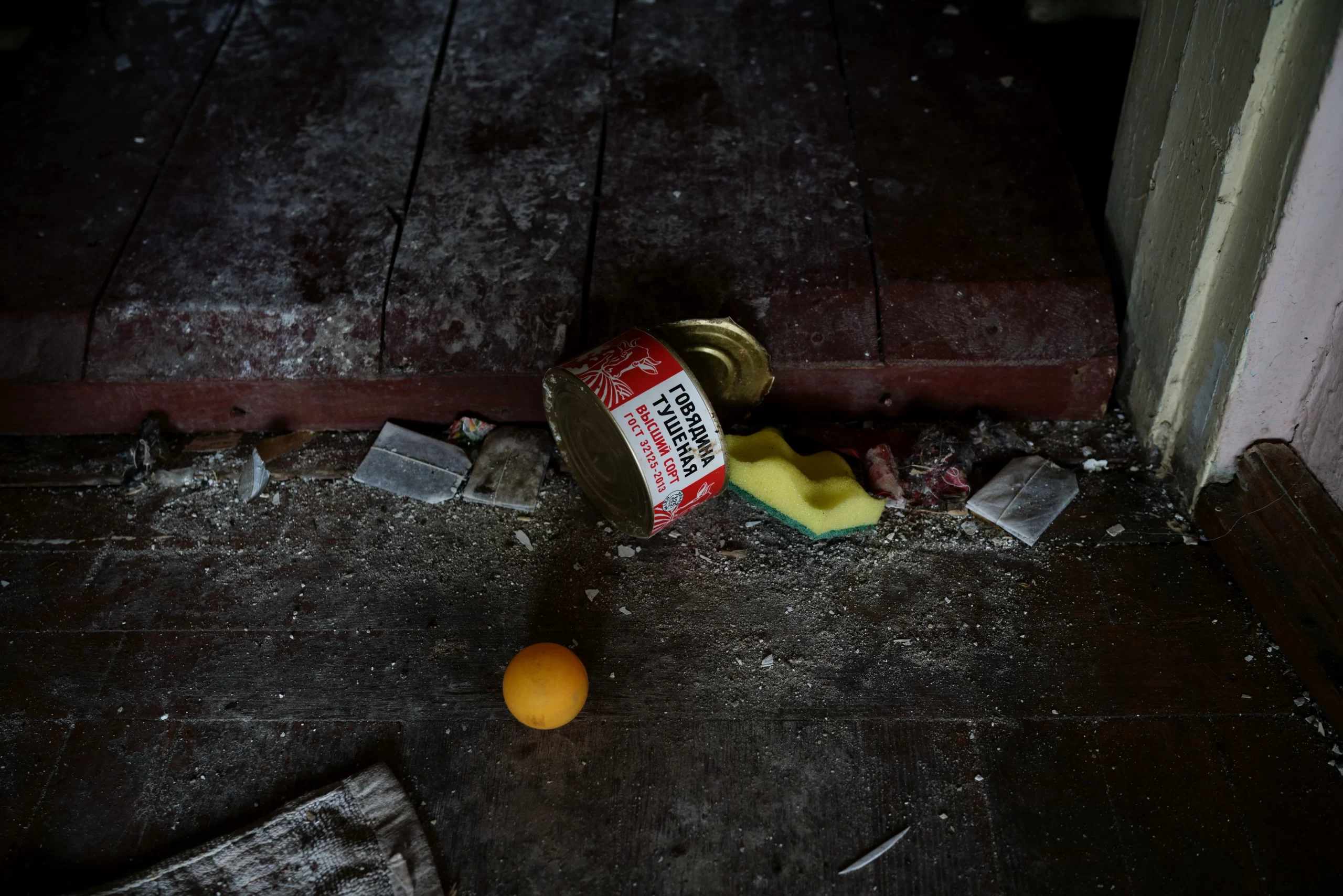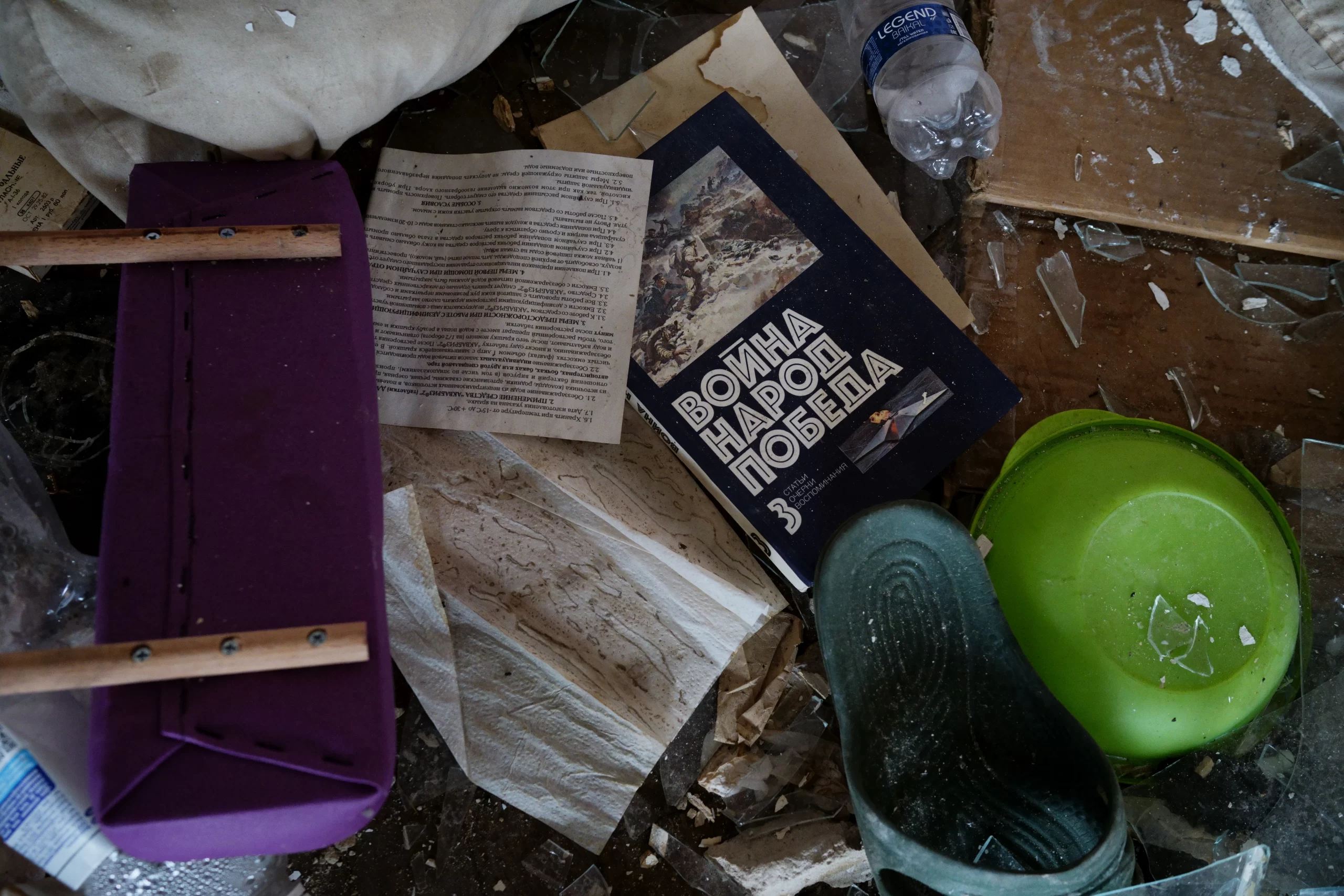Above the stairs hangs a large picture of an astronaut, with a bunch of garbage and rags under it. In one of the rooms, the occupiers left three-liter glass jars of canned Russian cabbage soup.