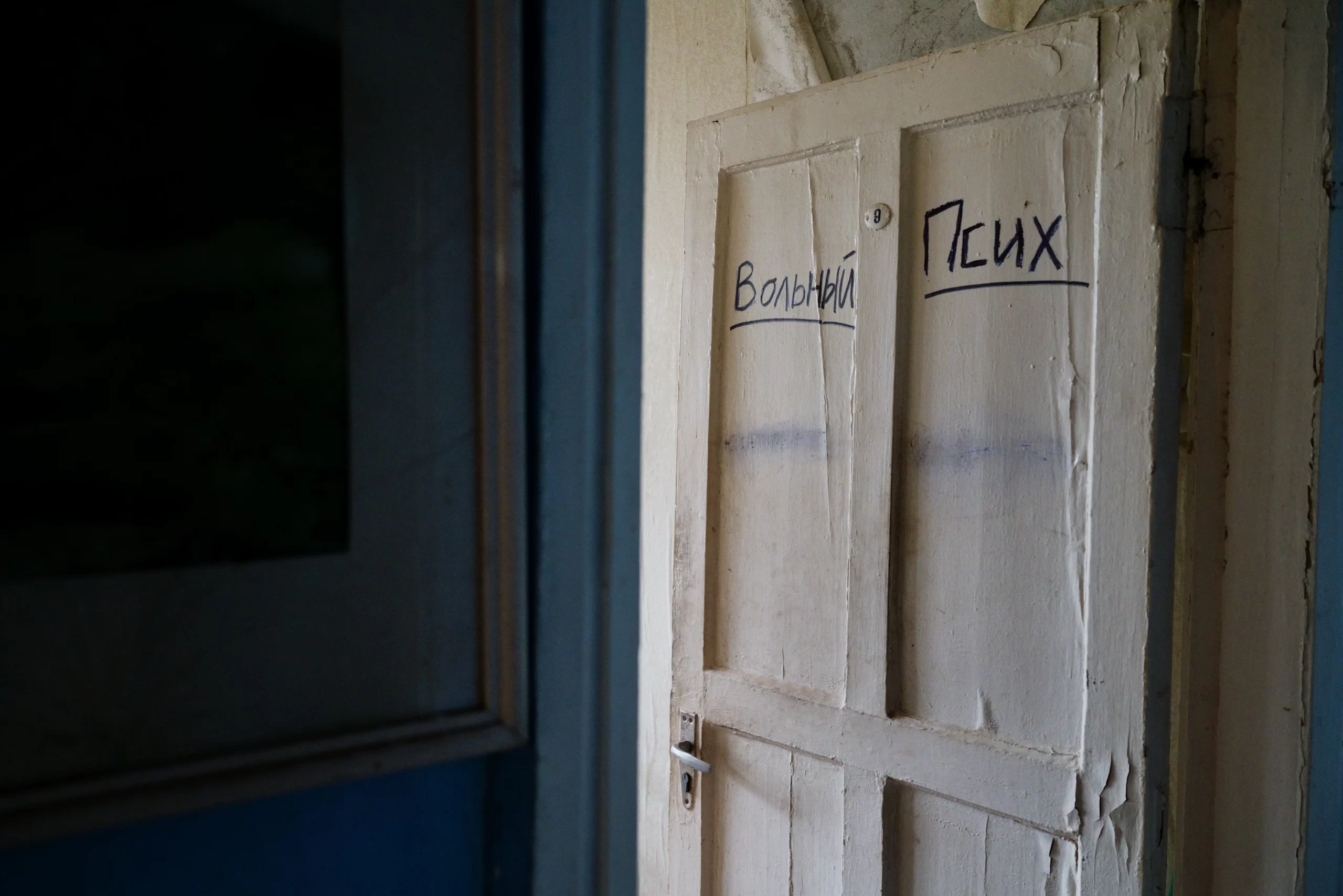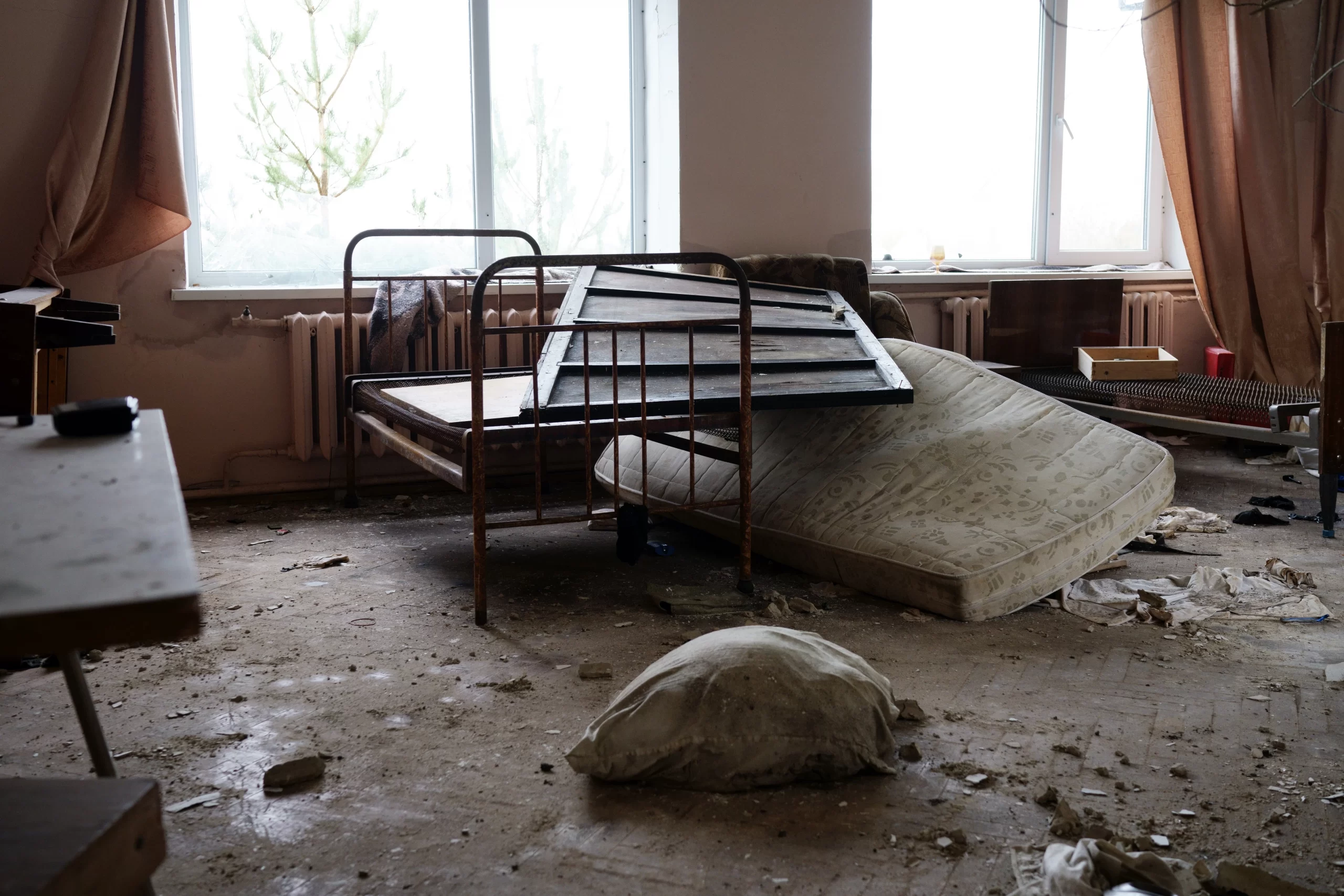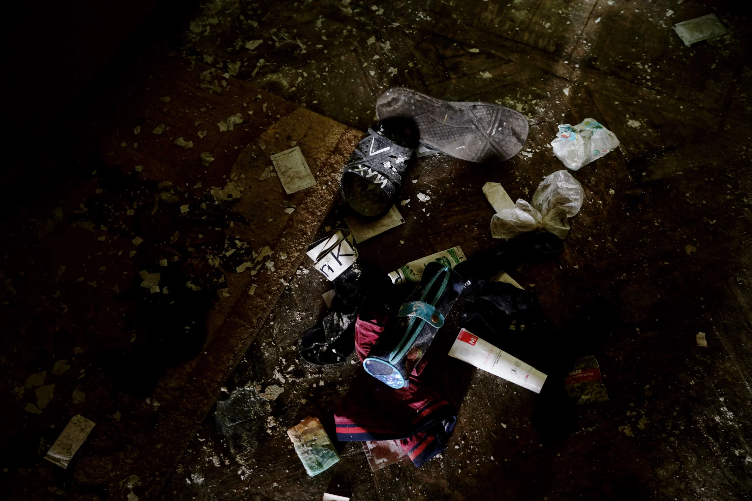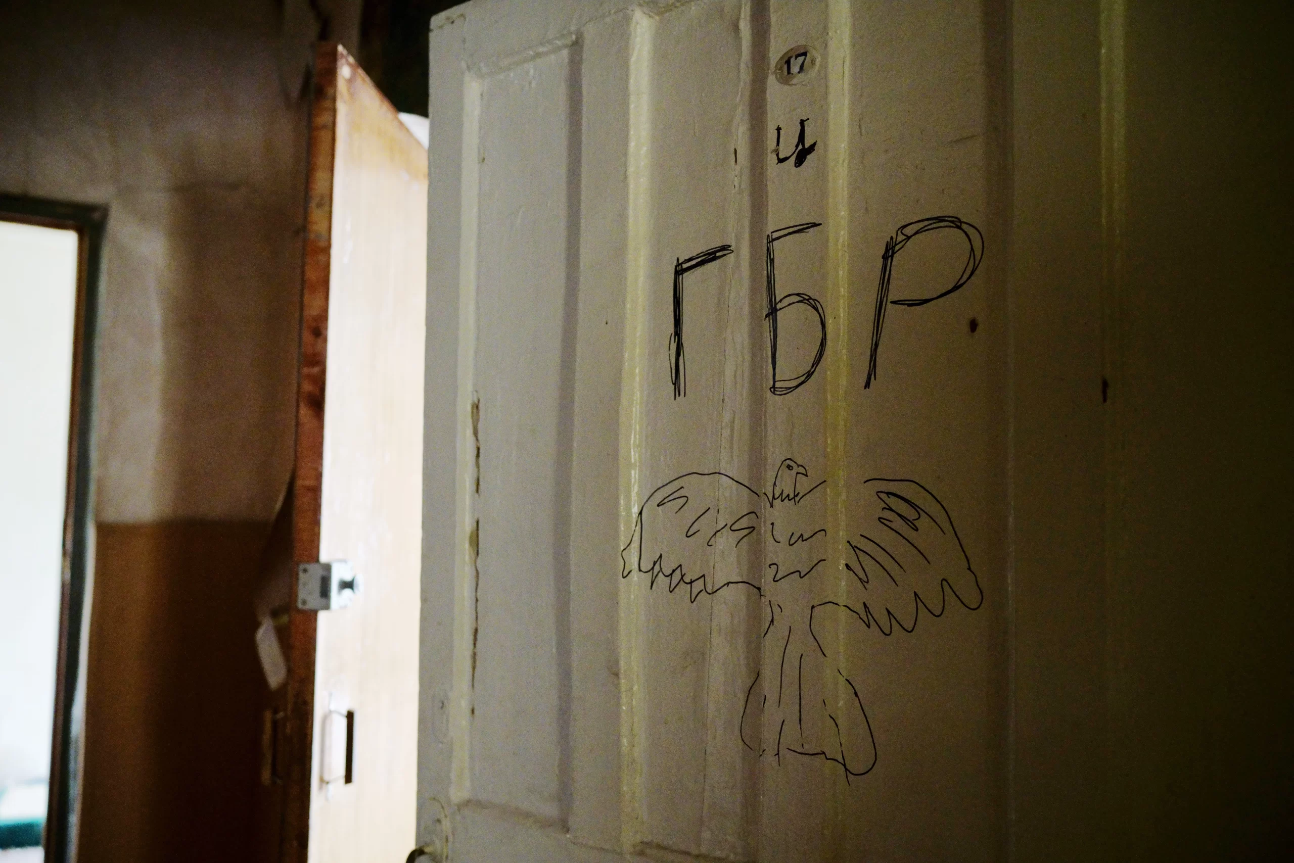 Above the stairs hangs a large picture of an astronaut, with a bunch of garbage and rags under it. In one of the rooms, the occupiers left three-liter glass jars of canned Russian cabbage soup.