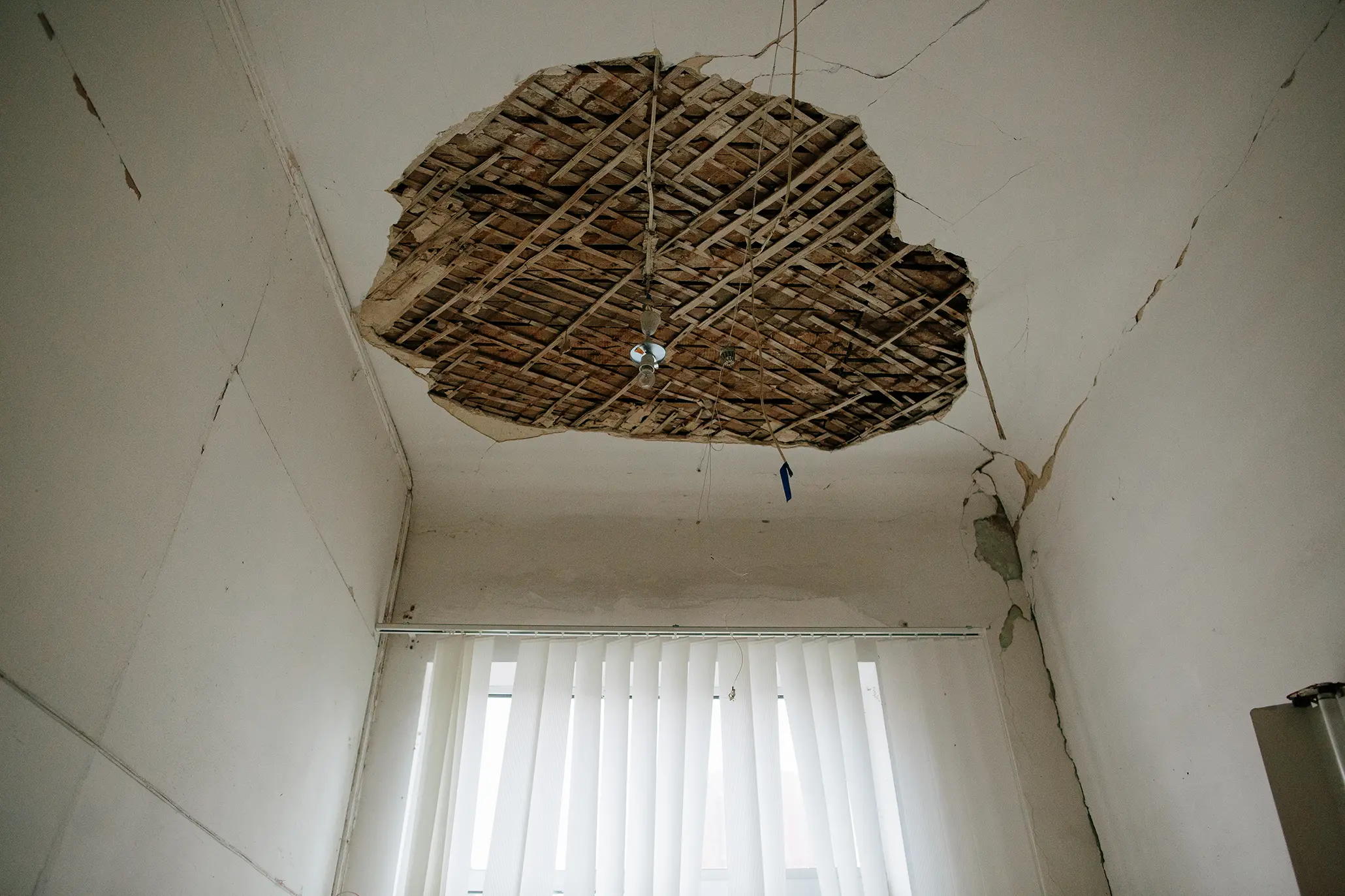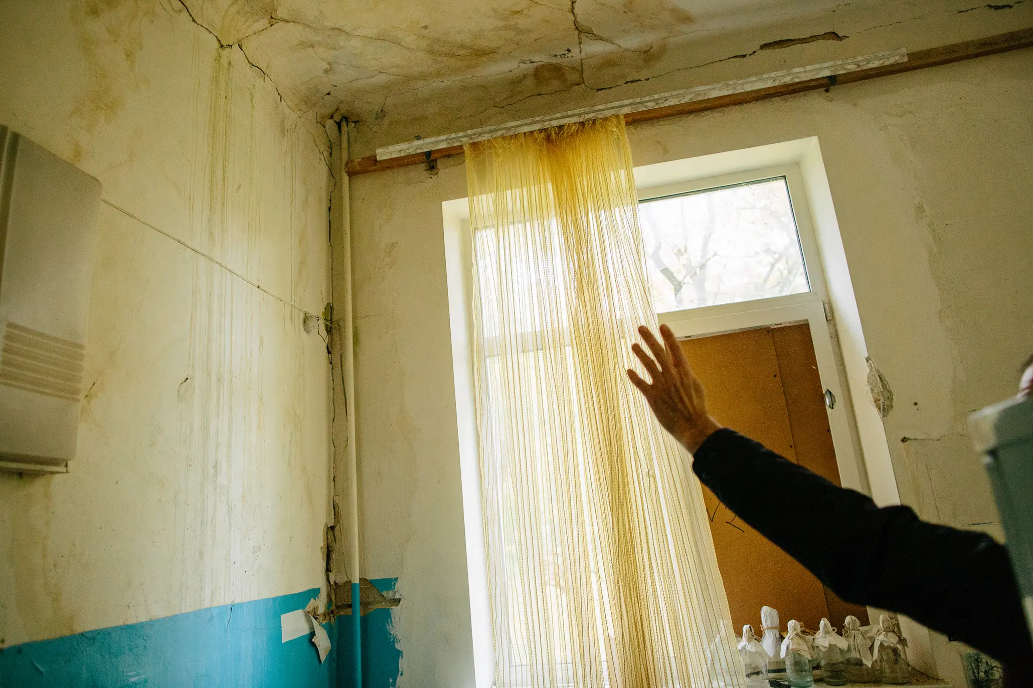 Юрій Миколайович показує вікна, які латав сам. У стінах кількох кімнат — дірки від уламків. Осколками посічені підвіконня і мікрохвильова піч. В одній з кімнат обвалилася стеля: пошкодило дах будівлі, і через вибухову хвилю вона впала. Чоловік попереджає, що перебувати тут небезпечно.
