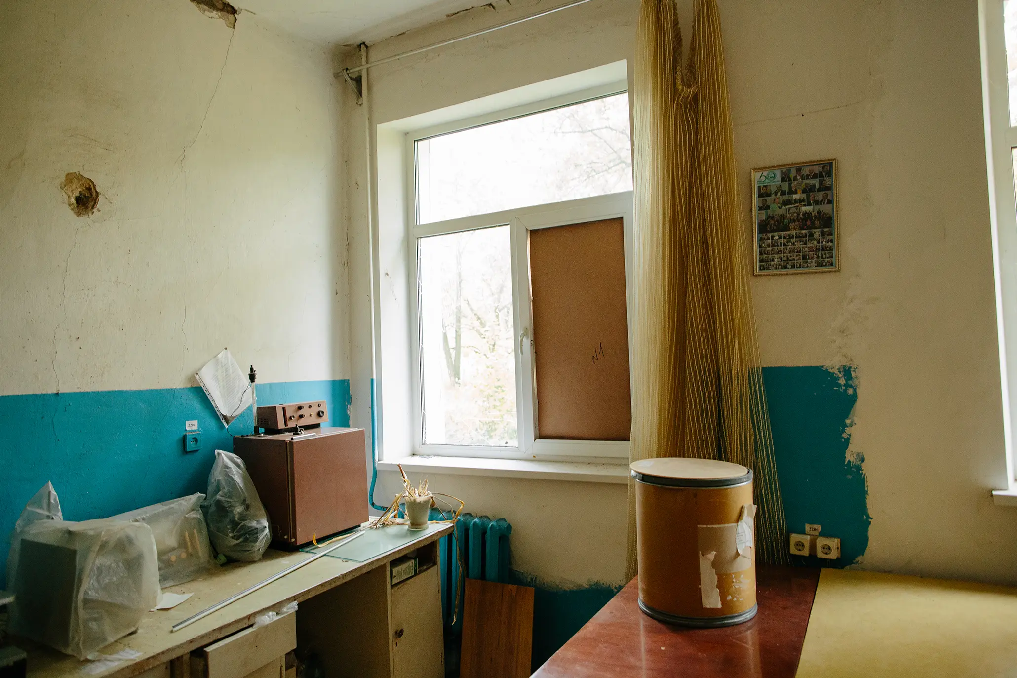 Деякі кімнати корпусу облаштували і проводять у них дослідження: на столах вишикувалися банки з рідиною. В одній з кімнат чоловік показує нам «гойдалки для банок» — щоби відбувалася краща агрегація в повітрі і бактерії краще розмножувалися. Однак зараз температурний режим для цього не підходить, тому «гойдалки» порожні.
